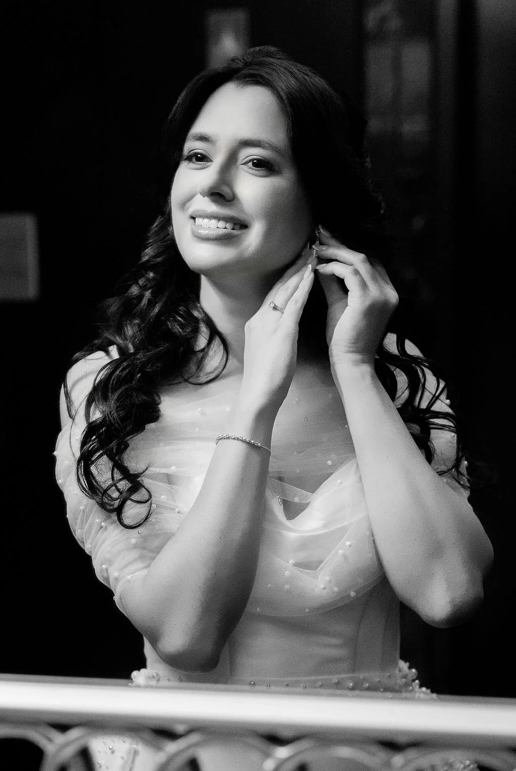 Bride putting on her earrings in front of a mirror, in a black and white portrait
